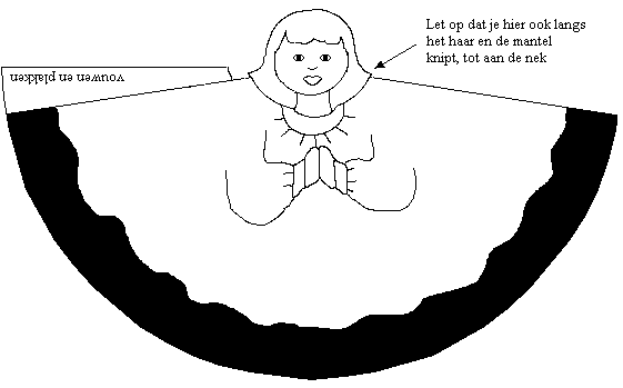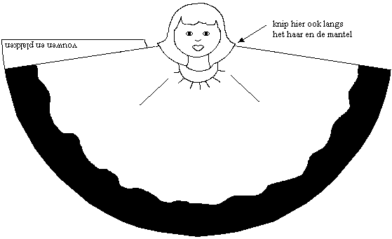 maak een sneetje in het sjabloon op de aangegeven plaatsen; steek hier de armen in en lijm ze langs de vouwlijn aan de achterkant vast